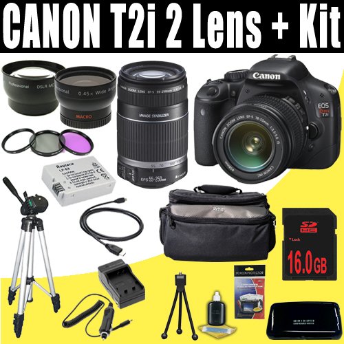 Canon EOS Rebel T2i 18 MP CMOS APS-C Digital SLR Camera + Canon EF-S 18-55mm f/3.5-5.6 IS Lens + Canon EF-S 55-250mm f/4.0-5.6 IS Telephoto Zoom Lens + 16GB Deluxe Accessory Kit Best